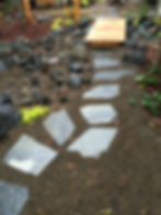 Rock steps and path lead you from the driveway to a small bridge that takes you over the dry stream bed. Meandering through the art screens is a moss garden that will spread and grow under the mature trees.